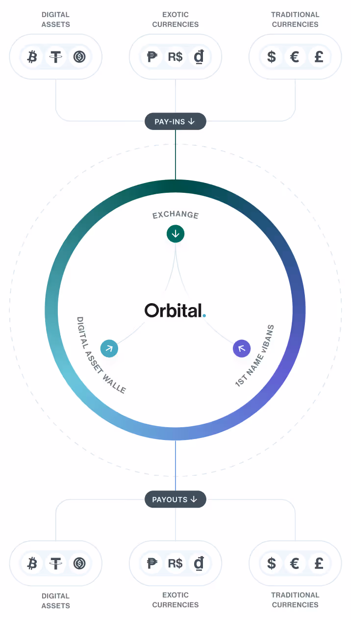 Receive, exchange and settle all major digital assets, traditional currencies and 80+ exotic currencies interchangeably - through one powerful platform. Engage with your global payments world through the Orbital Platform available via: Web Platform, API or OTC Desk